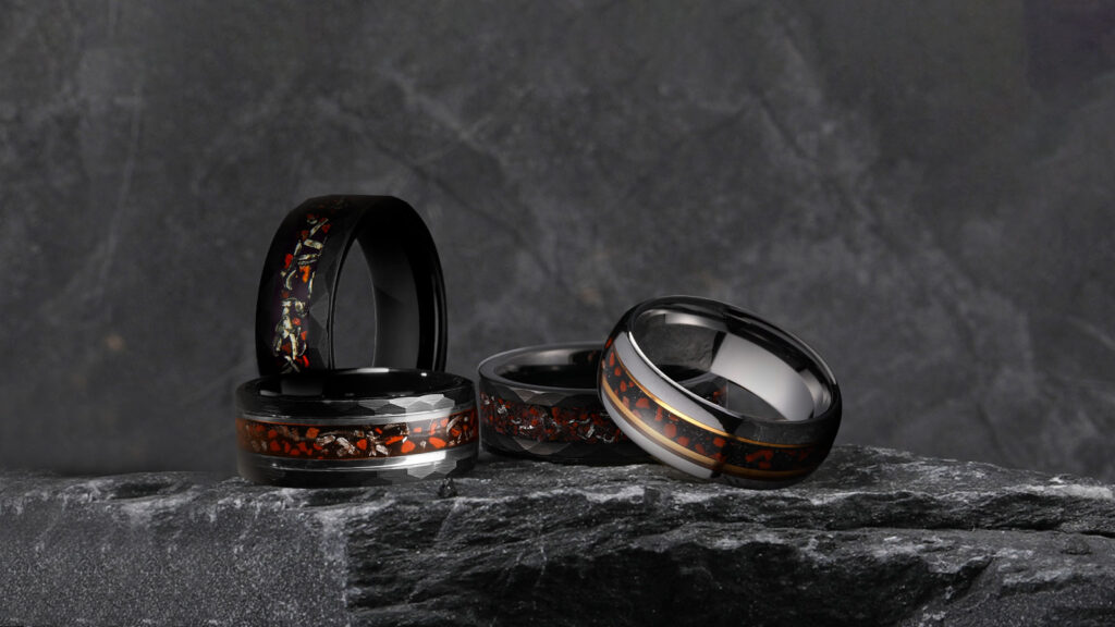 Want something truly rare? Meteorite rings contain fragments that have traveled through space for millions of years.